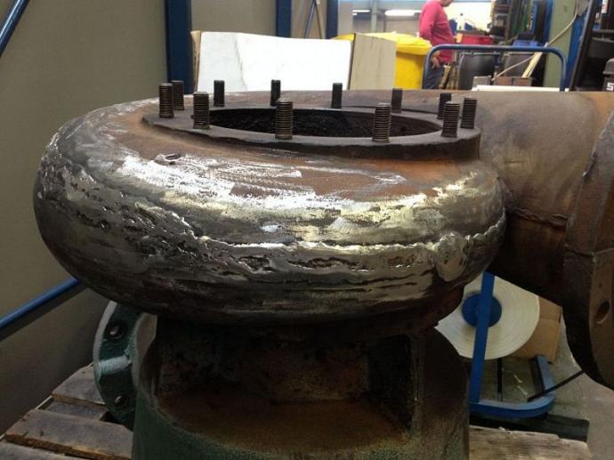 Dit gescheurde pomphuis van gietijzer is gerepareerd door de scheur uit